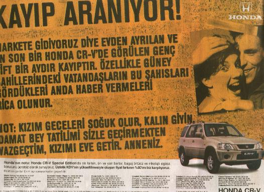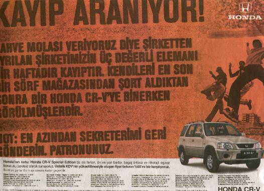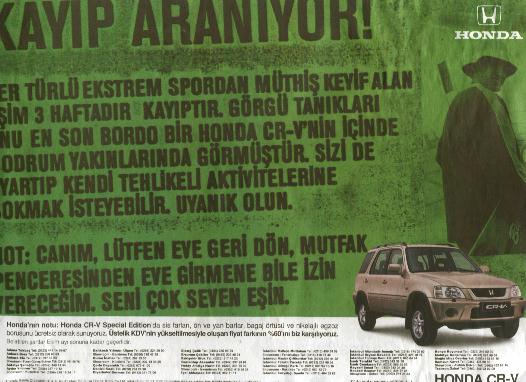 Honda'nın Türkiye deki Reklam ajansı Total tarafından hazırlanan çalışmalar Honda CR-V modelinin cazibesi ve ona yarattığı bağımlılığı vurgulamakta.