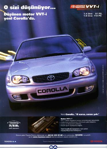 Corollanın yeni motoru elektronik kontrollü, verilen mesajda bu yüksek teknoloji vurgulanırken bununla beraber "O varsa sorun yok" mesajıda artı bir kalite imajı ekliyor .