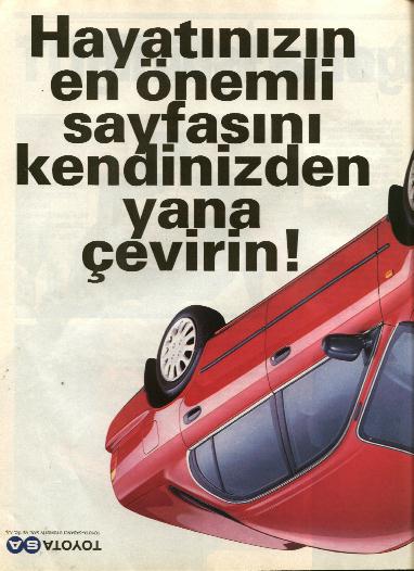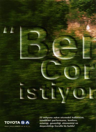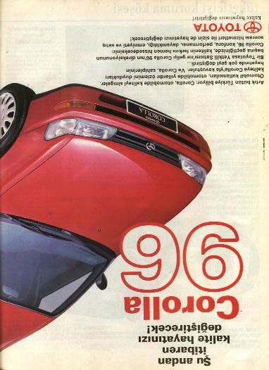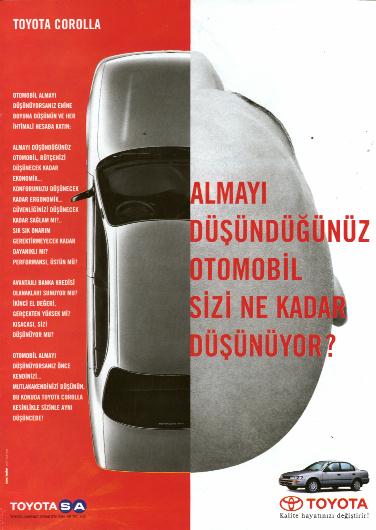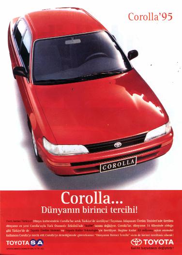 Toyota'ını Corolla modeli 1966 yılından beri pazarda. Dünyanın en sorunsuz otomobili ünvanına sahip Corolla dünyanın birinci tercihi olmaya devam ediyor. Reklam kampanyaları ı bu mesajla uygunluk taşıyor. 1994 yılında kazanılmış ödül |