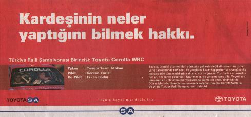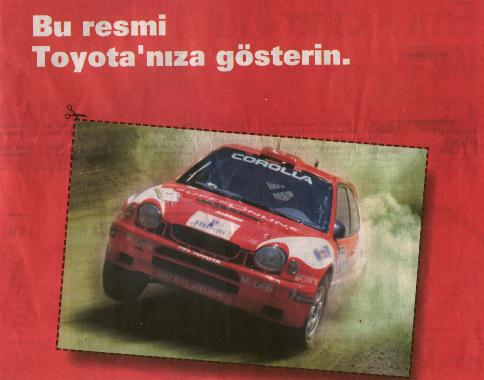 Toyota dünya'nın en ünlü otomobil yarışlarında daima en önde . 1999 yılında Dünya Markalar Şampiyonu ünvanını kazanan Toyota , Corolla WRC ile bu yıl da Türkiye Ralli Şampiyonası birincisi. REKLAM AJANSI rpm/radar cdp Europe... |