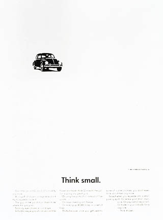 | Amerikan reklamcılık dergisi Advertising Age ,Volkswagen ‘nin “ Think Small “ sloganlı 1959 yılından kalma bu kampanyayı asrın reklamı seçerken ,içerikte kuyruklu otomobillerin ülkesine büyük bir cüretle küçücük kalıpları sığmayı dikte ediyordu. Yüzyılın TOP 100 Reklam kampanyası arasında birinciliğe layık görülen VW Geniş Bilgi. (İngilizce)---- Diğer VW kampanyaları |
